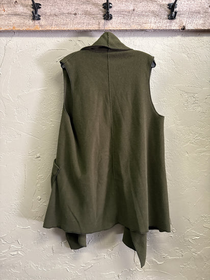 Description : Sleeveless fleece vest in a dark olive green with a draped waterfall collar and open front, featuring two large front patch pockets and a slightly flared hem. The fabric is soft and textured, giving a cozy, layered look