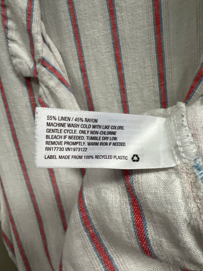 Description : Perfect for the hot weather! This linen blend crop shirt is lightweight and features a button-up front, collared neckline and vertical stripes in white, red and blue.
