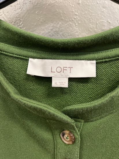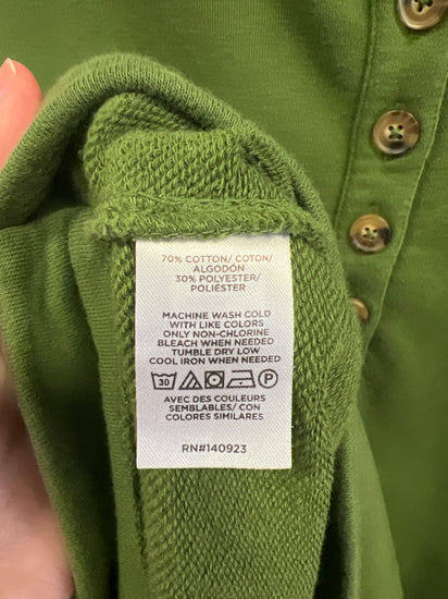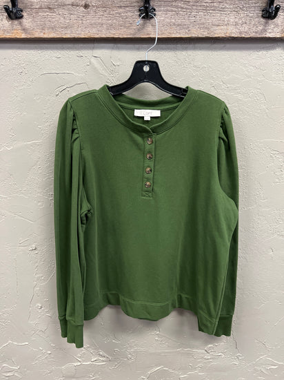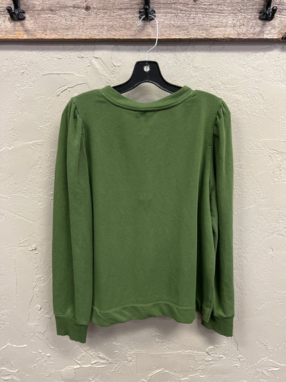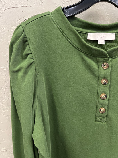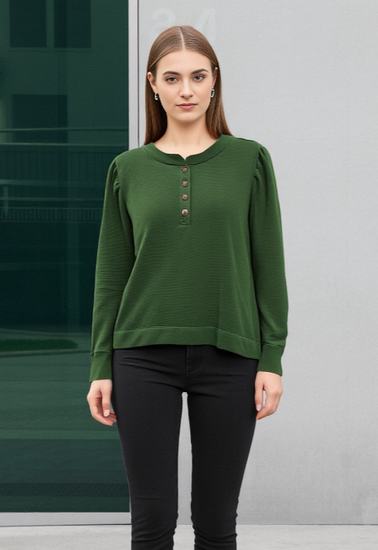 Description : Long sleeve green top with a slightly loose fit, featuring a round neckline, front buttons, and small shoulder ruffles.