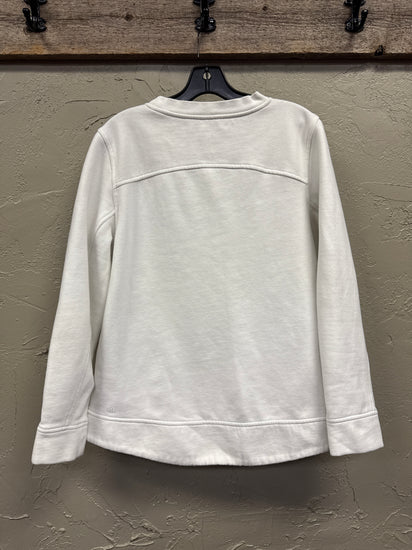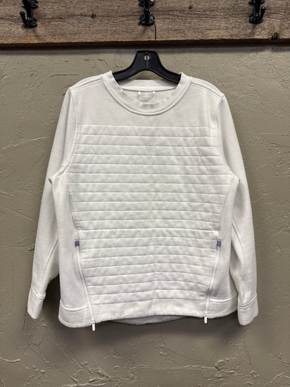 Description : White crewneck sweatshirt with horizontal quilted detailing on the front and zippered side seams with small purple tabs