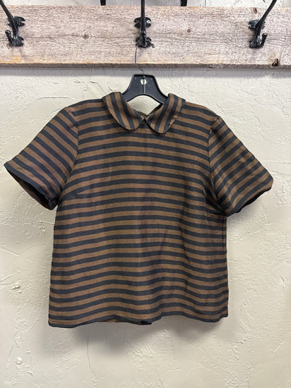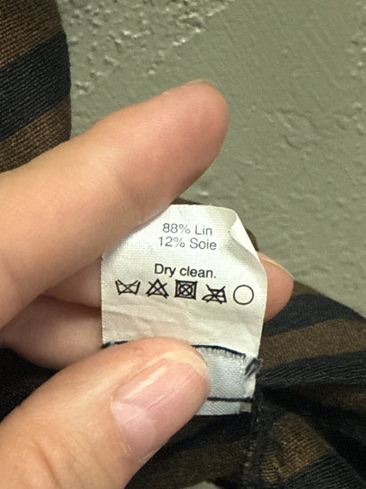 Description : Madewell black and brown striped blouse/snap button back blouse. 88% linen and 12% silk fabric gives off a fancy sheen, boxy fit.
