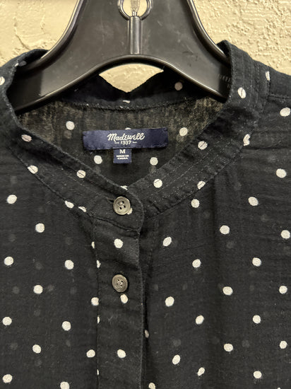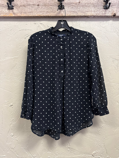 Description : Black with white polka dots in a slightly sheer, 100% cotton fabic. Features a band (mandarin) collar and a center partial button placket. The front is loose-fitting with a slightly curved hem and buttoned sleeve cuffs