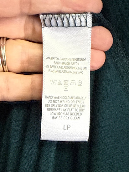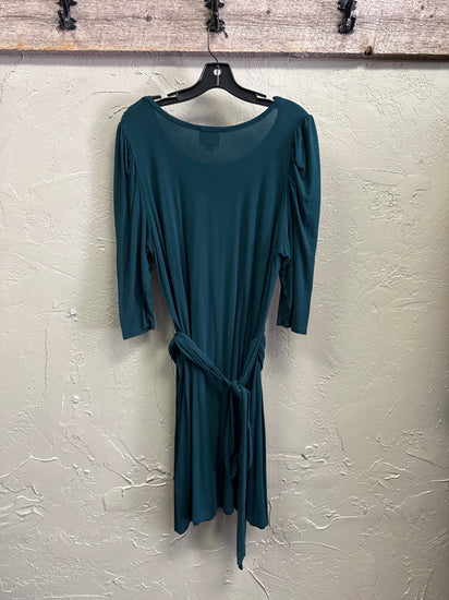 Description : Belted, knee length dress featuring a scoop neckline and three-quarter sleeves, made from a soft, drapey jersey fabric; features a self-tie belt at the waist and a straight, slightly gathered skirt. The front shows simple, unadorned styling with subtle shoulder gathers.