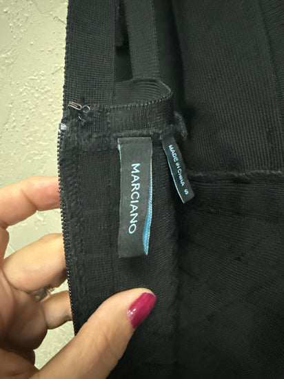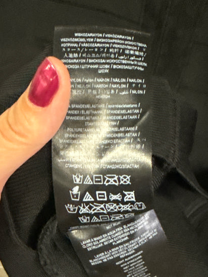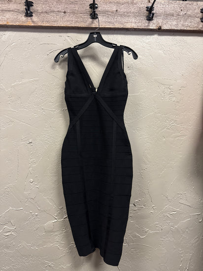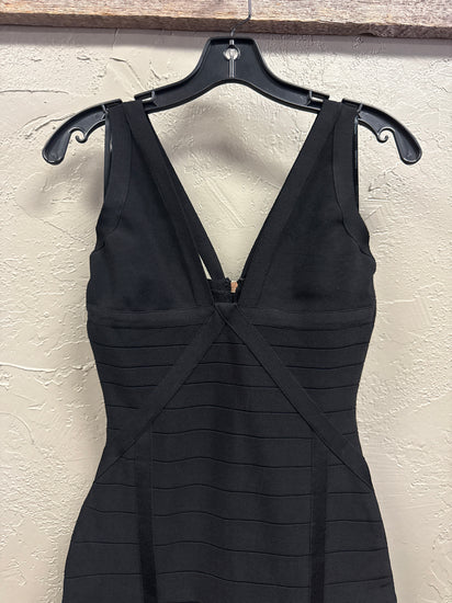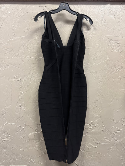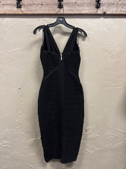 Description : Black bodycon dress in a fitted silhouette featuring a v-neckline, wide shoulder straps, horizontal ribbed texture and full back zipper