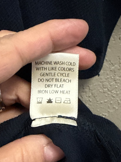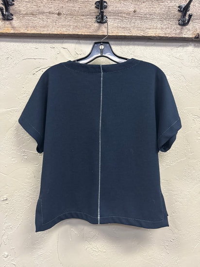 Description : Midnight blue, crew neck, short-sleeved top with subtle contrast stitching around the neckline, sleeves, and hem