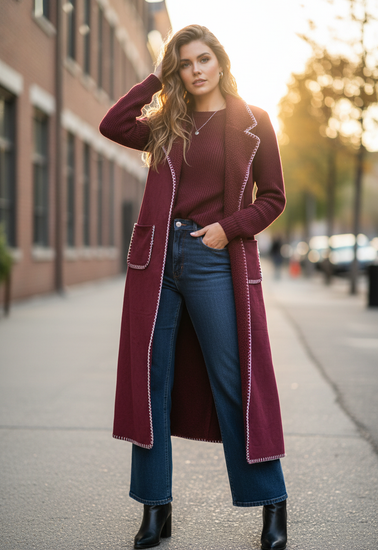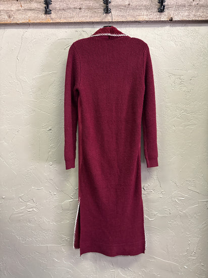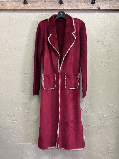 Description : Long open-front duster cardigan with a plush shawl collar, long knit sleeves, two patch pockets and distinctive white whipstitch trim along the edges and hem.