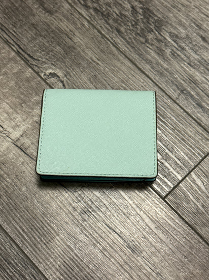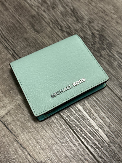 Description : The wallet pictured is a Michael Kors medium saffiano leather wallet, typically a bifold style, in a mint or light green color. This style is part of the popular "Jet Set" travel collection and is known for its durability and functionality.