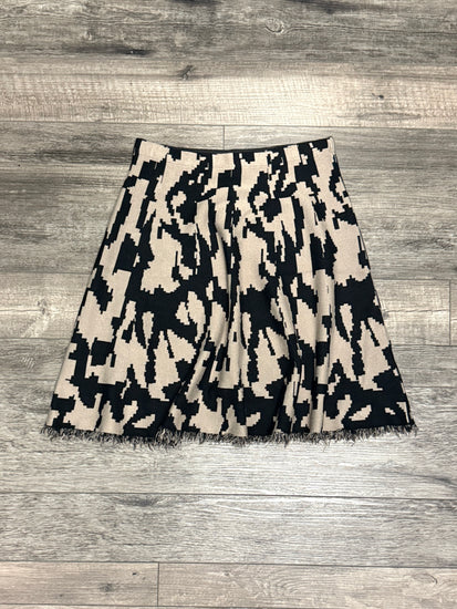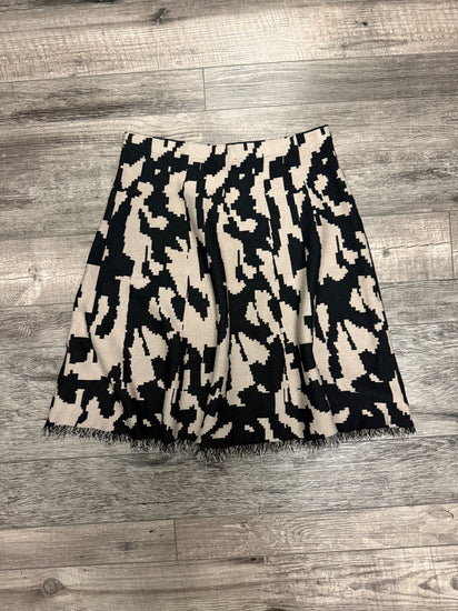 Description : A-line skirt in a black and beige abstract jacquard pattern with a textured woven fabric, fitted waistband, gentle pleating for flare, and a short fringed hem. The high-contrast graphic print dominates the front