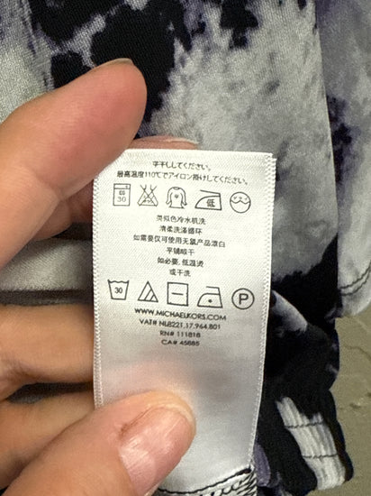 Description : Off-the-shoulder blouse in black with white and lavender abstract tie-dye splatters, featuring an elasticized neckline, a loose bodice, 3/4-length sleeves, and an elasticized hem.