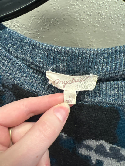 Description : Oversized fit knit sweater in a multicolor camouflage pattern in shades of blue, gray, and black. Features a wide neck, drop shoulders and ribbed cuffs & hem.