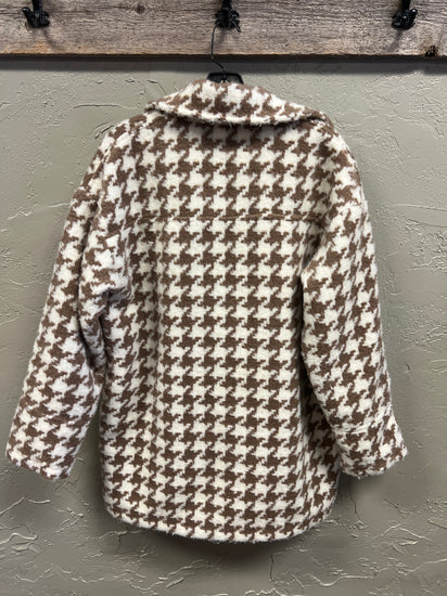 Description : This shacket features a relaxed, oversized silhouette, collared neckline, front button closures with large buttons and two chest pockets with flaps all in a classic houndstooth pattern.