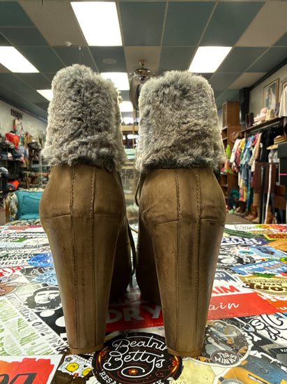 Description : New without Box. Stylish faux fur-lined wedges with lace-up design for added comfort and warmth during colder months, providing both fashion and practicality. • Faux fur collar for added warmth • Lace-up closure for secure fit • Durable wedge heel for stability • Leather upper for a premium look