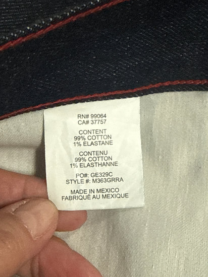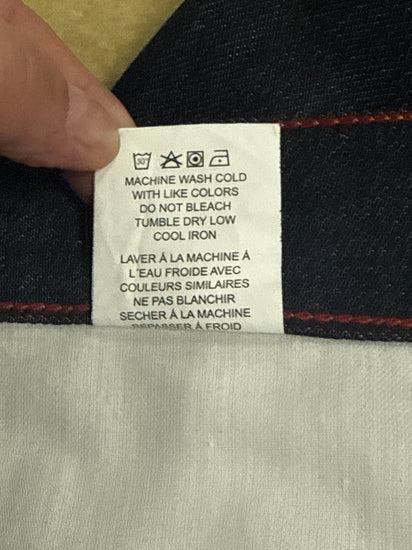 Description : New without tags, dark wash denim jeans with visible contrast stitching around the pockets and seams, featuring a classic five-pocket design.