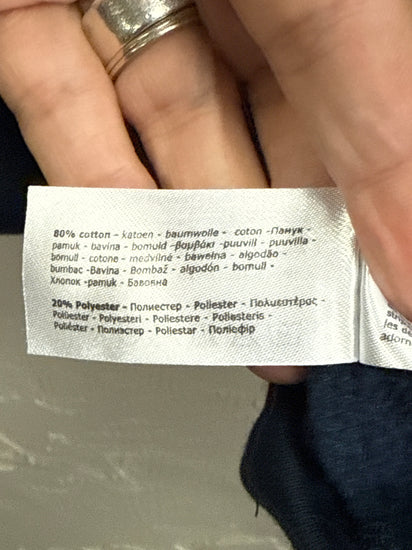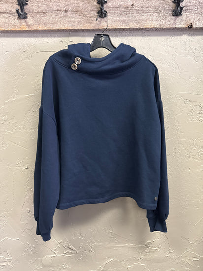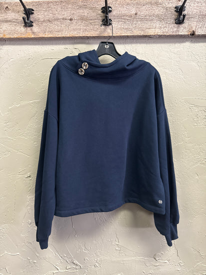 Description : New without tags long-sleeve navy sweatshirt with a relaxed fit, featuring a high funnel neck & hood; with two metallic buttons on the left shoulder and ribbed cuffs and hem.