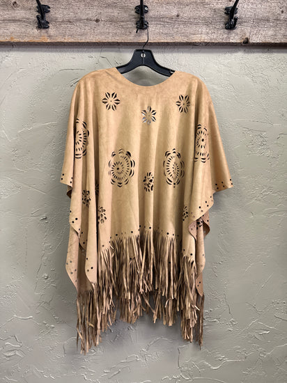 Description : New without tags, laser-cut suede-like poncho in a warm camel/tan color with a scoop neckline, scattered floral geometric cutout patterns across the front, and long fringe along the hem. It has a loose, draped fit with short wide sleeves and a soft matte texture