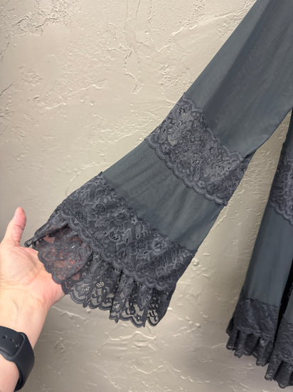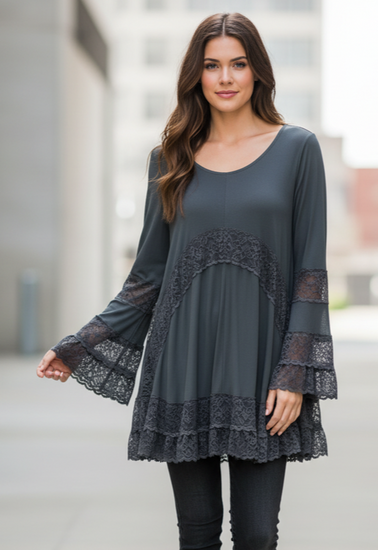 Description : New without tags, lovely and lacy, feminine and fun, this tunic checks all the style boxes. Designed to move with flowy mesh and lace, it turns any day into the best day as you step up your workday wear or play it casual on the weekend. Partially lined at the body, the sleeves get flinty with their sheer style and create a charming look when paired with denim or a fancy one when you do cropped pants. Tap into your care-free girly girl with a couple of rings and a loose braid in your hair and you’re done.