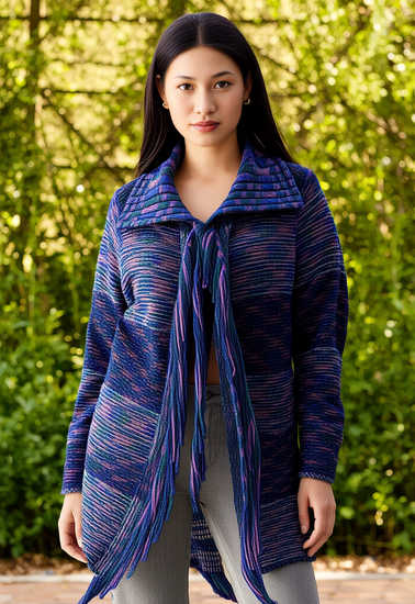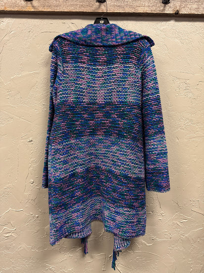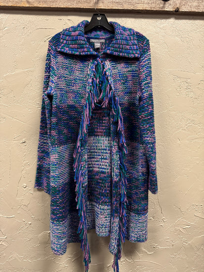 Description : New without tags, sweater with a large, ribbed collar, open front with a single closure featuring long, fringed ends, multi-colored knit pattern predominantly in shades of purple, blue, and green, long sleeves, and a slightly longer length with a pointed hem at the front