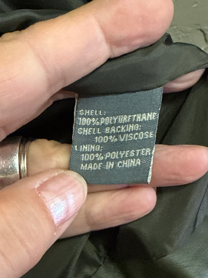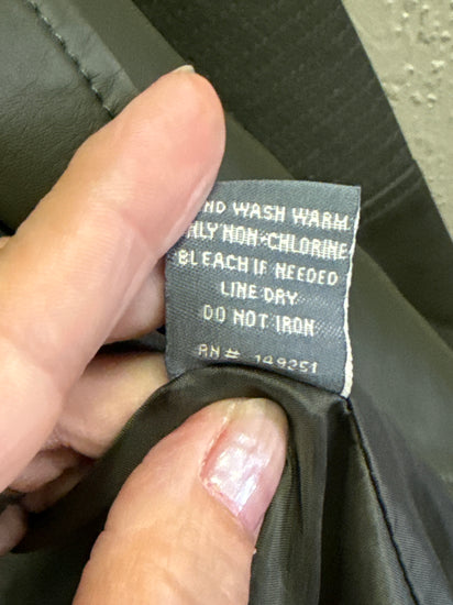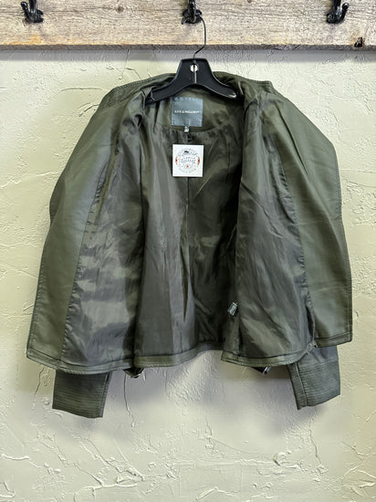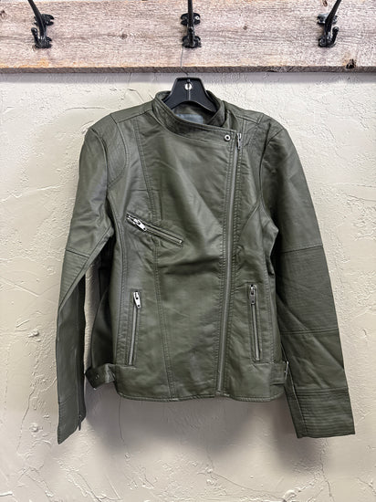 Description : New without tags, olive green faux leather moto jacket with an asymmetric front zipper, multiple zip pockets, quilted elbow panels and a short stand collar. The front shows seam detailing and zip cuffs for a tailored, edgy look.