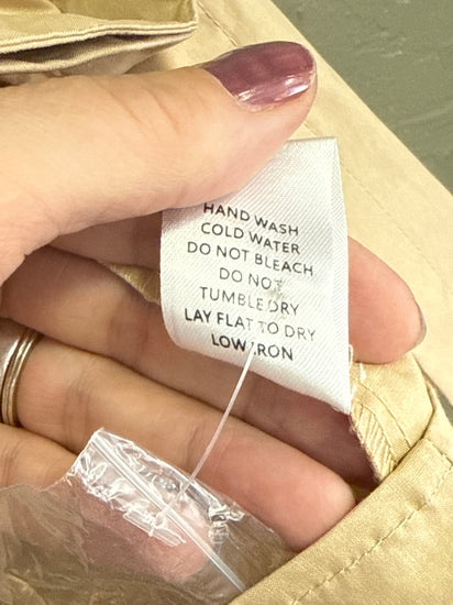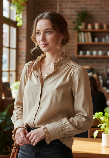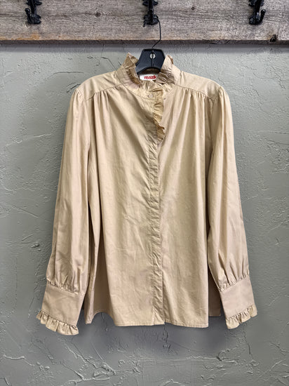 Description : New without tags, long-sleeve button-up blouse in a warm tan color with a small ruffled stand collar and ruffle-trimmed cuffs, featuring a simple front placket and slightly gathered shoulders for a relaxed fit