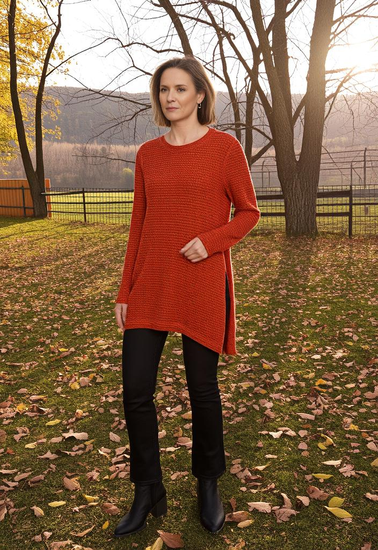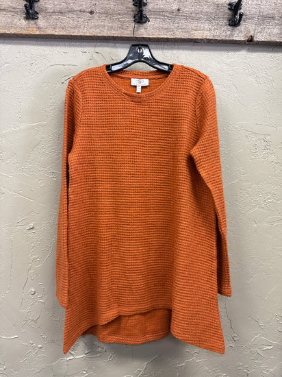 Description : New without tags waffle knit tunic sweater with crew neckline, a slightly curved hem and button detail on sleeve.