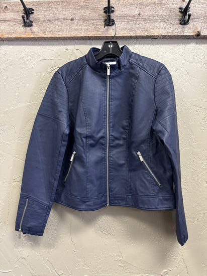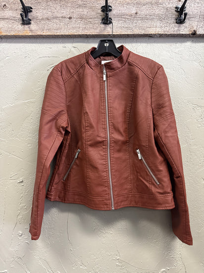 Description : New without tags. Express your cool, casual style in this OSO essential, OSO Casuals® moto jacket! A main zipper runs up the center front of the supple faux leather jacket to a mandarin-style collar, while four more smaller zippers close off the two front pockets and sleeve cuffs. This versatile jacket can be layered over just about any outfit, whether it's a graphic tee and jeans, a midi dress or even a sporty jumpsuit. You really can't style it wrong!