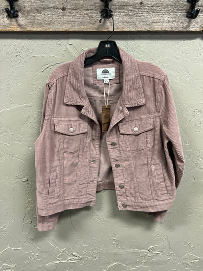 Description : Trucker style corduroy jacket in a muted pink color with button-up front, two chest pockets with flaps and buttons and collared neckline.