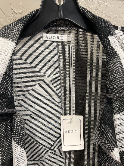 Description : Long, open-front duster, featuring a mix of bold black and white patterns. Loose, relaxed fit with three-quarter sleeves. Textured fabric is lightweight and breathable.