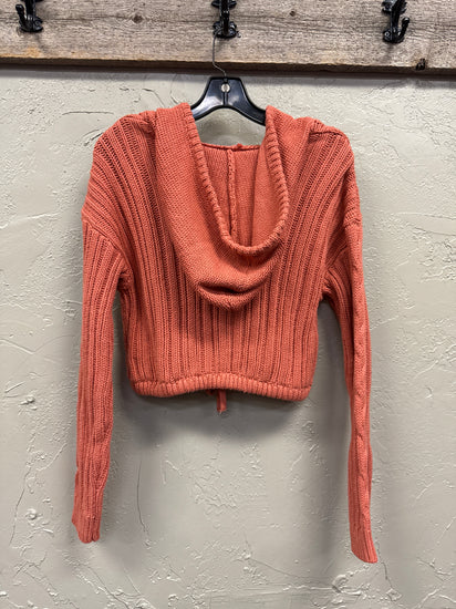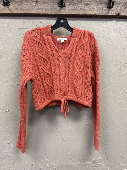 Description : New with tags, cropped cable knit hoodie with a V-neck and a drawstring hem. The hoodie features intricate cable knit patterns throughout