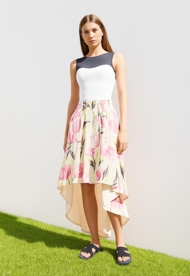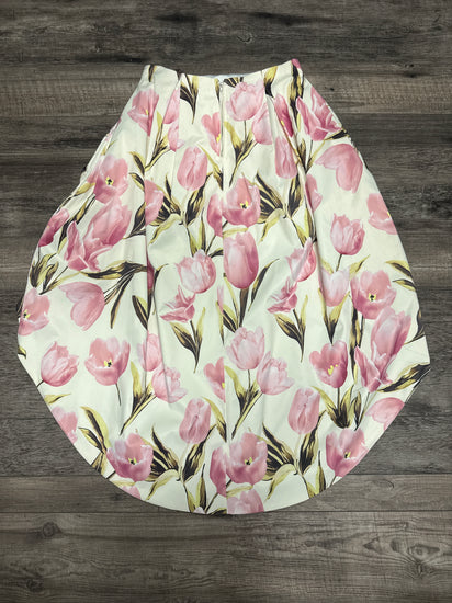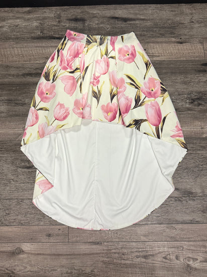 Description : Beautiful tulip print high-low skirt featuring a back zipper closure and pockets