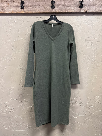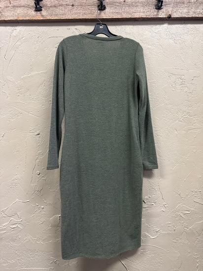 Description : New without tags, mid-calf length dress, long sleeves, v-neckline, solid dark green color, soft texture, slightly fitted, straight shape.