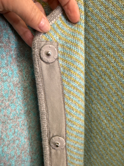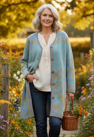 Description : Knee-length knitted cardigan/coat in a heathered grey base with a muted floral jacquard in aqua, light blue and chartreuse; features a 5 button closure, long sleeves, and a soft, textured wool-like fabric. Front is straight-cut with a simple open placket and subtle contrast trim along the opening.
