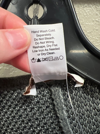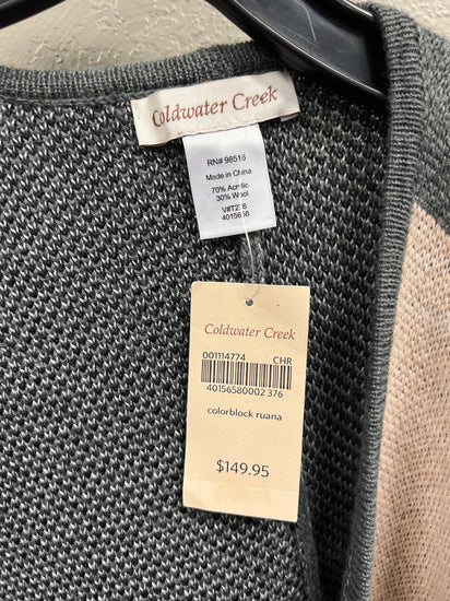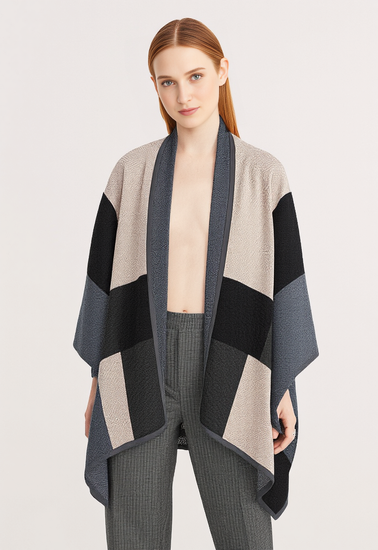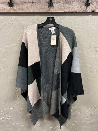 Description : New with tags, colorblock wrap, features large geometric patterns in varying shades of black, gray, and beige with an open front design, no fastenings, wide sleeves, textured knit material, relaxed fit, longer length at the front edges forming a draped silhouette
