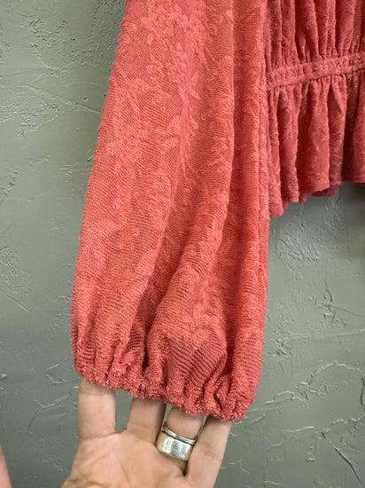 Description : New with tags, long-sleeve scoop-neck blouse in a textured fabric with a gathered empire waist and peplum hem, elasticized cuffs, and a subtle embossed floral pattern.