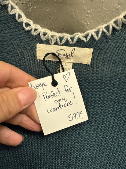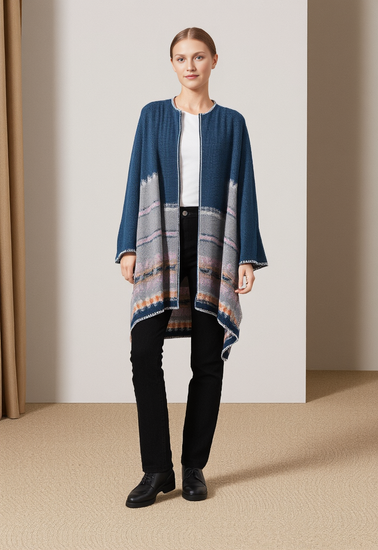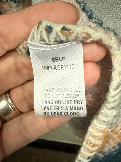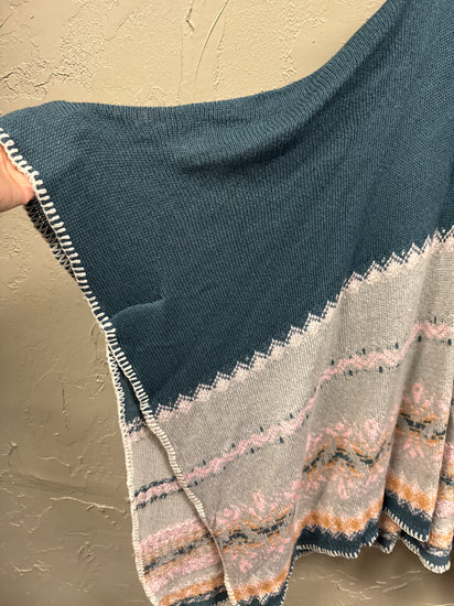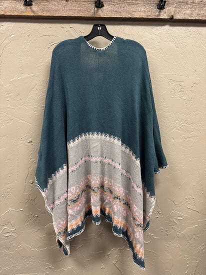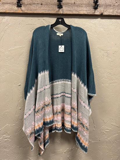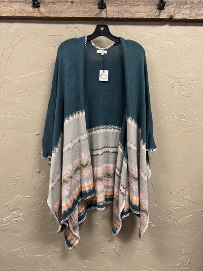 Description : New with tags teal open-front wrap, with multicolored horizontal stripes in gray, pink, and orange at the lower portion, contrasting white stitching along the edges, lightweight knit material, and a wide rounded neckline.