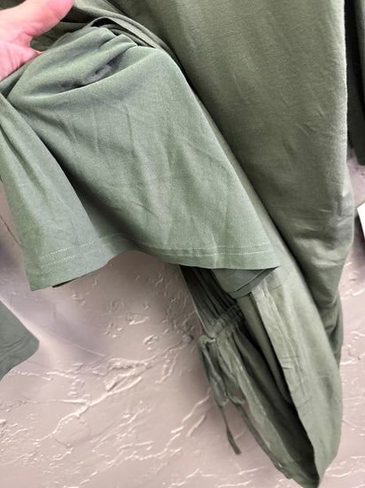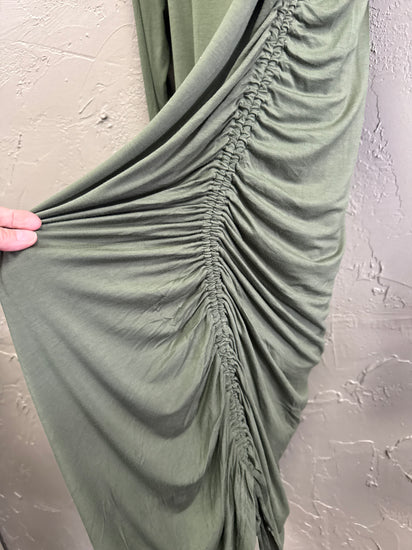 Description : New with tags maxi dress in a muted olive green with long sleeves, a round neckline, and gathered ruching along one side creating soft draping down the skirt
