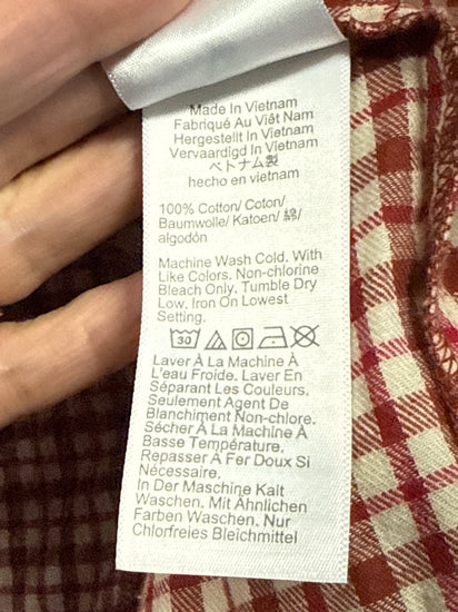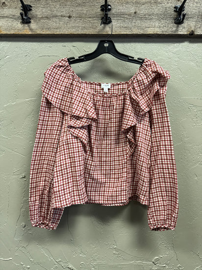 Description : New with tags brown, red and white gingham plaid shirt with ruffled details around the neckline and chest, and long sleeves.