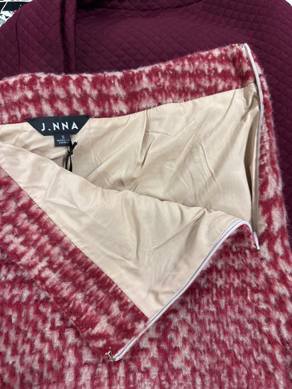 Description : New with tags A-line mini skirt in a textured tweed/knit fabric featuring a red and cream large-scale plaid pattern and a straight waistband with a slightly fuzzy finish.