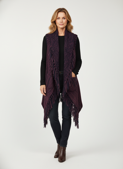 Description : new with tags, maroon and navy blue knit sweater vest with an open front, fringe detailing along the hem and pockets