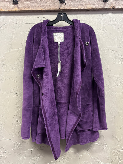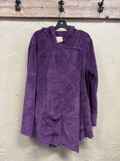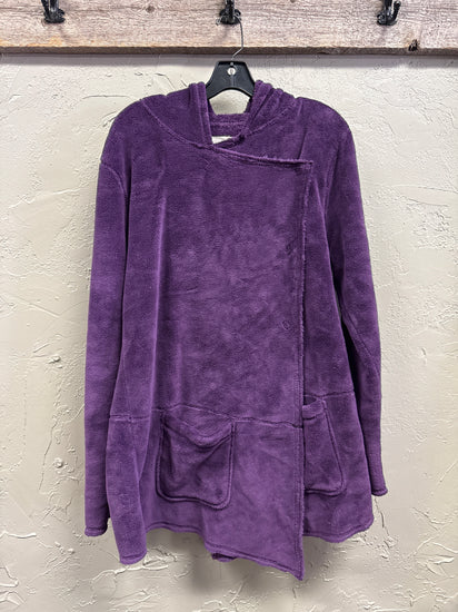 Description : New with tags hooded fleece featuring an asymmetrical front closure, two front pockets with rounded edges, long sleeves, soft texture and above the knee length