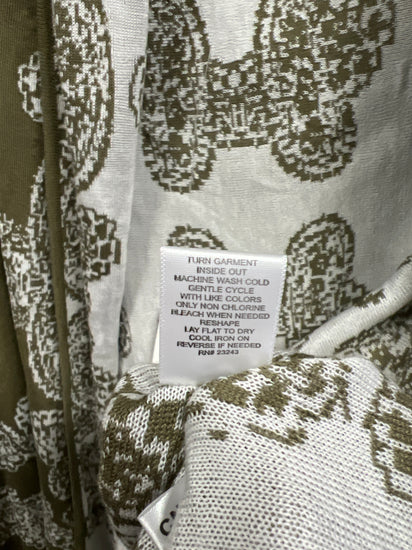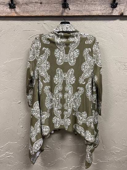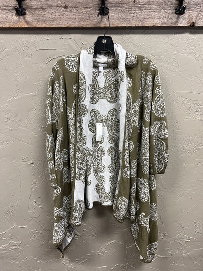 Description : Asymmetrical open sweater featuring 3/4 length sleeves, an intricate white floral pattern and a flattering loose drape.