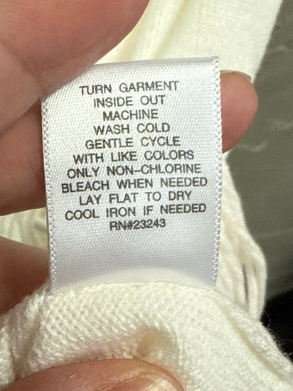 Description : New with tags off-the-shoulder sweater dress in a soft winter white with a wide folded neckline, three-quarter sleeves, straight midi length and long fringe trim along the hem