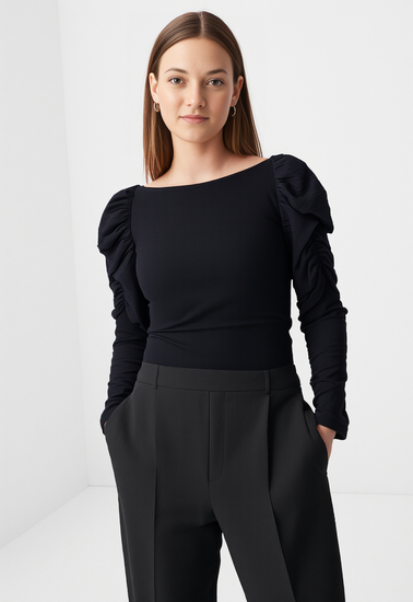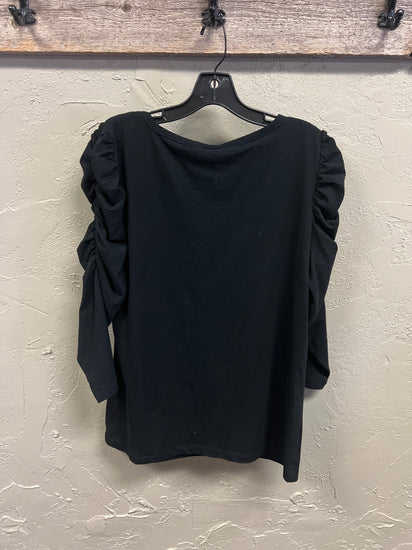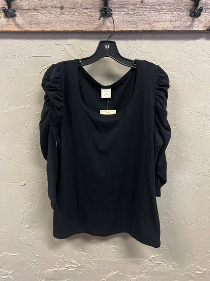 Description : New with tags black top, with ruched sleeves, a scoop neckline, fitted body and 3/4 long sleeves.