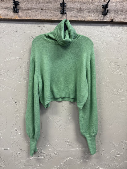 Description : New with tags cropped, mint green turtleneck sweater with a ribbed texture and balloon sleeves that taper at the wrist.