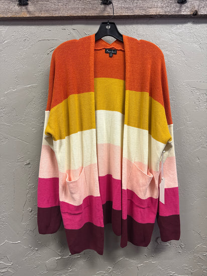 Description : Open-front longline cardigan sweater with wide horizontal color-block stripes in orange, mustard yellow, cream, blush, fuchsia and burgundy, featuring long sleeves, front patch pockets and a ribbed knit texture