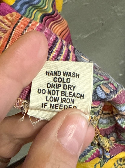 Description : Lovely floral, v-neck tunic, with tie at the waist, short sleeves, hem with horizontal stripes in pink, green, and blue,