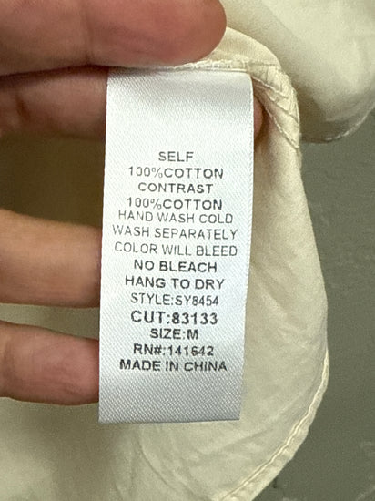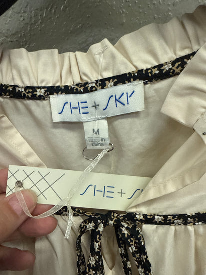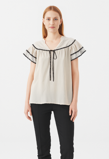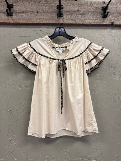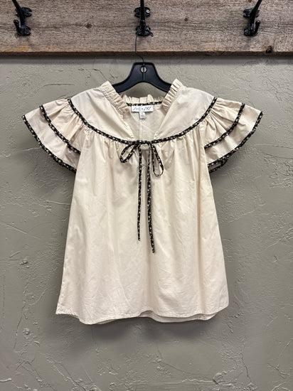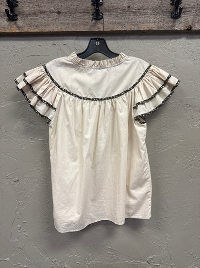 Description : New with tags beige short-sleeve top featuring ruffled sleeves with black trim, round neckline with a ruffled edge and tie at the neck with black detailing. Measurements are from the MEDIUM