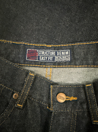Description : New with tags dark wash denim jeans with a straight leg fit. Visible features include classic five-pocket styling, a button and zip fly, and contrast stitching.