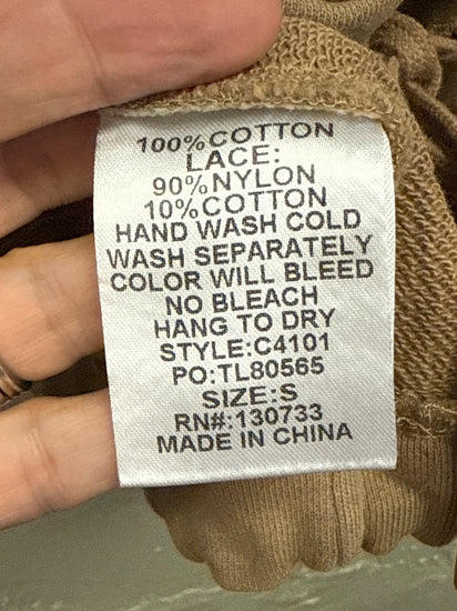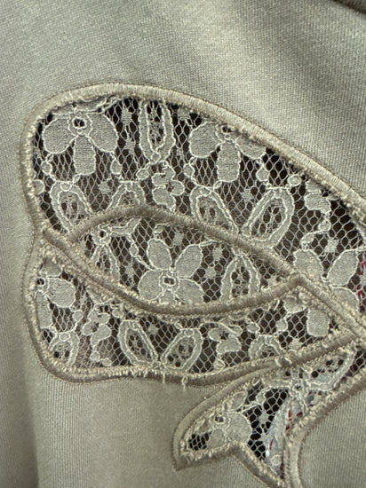 Description : New with tags. Get cozy and chic in their Latte Washed Sweatshirt! Made with 100% cotton and mineral washed for extra softness, you'll never want to take it off. The lace ribbon embroidery on the front adds a touch of femininity, making this sweatshirt perfect for any occasion - from lounging at home to running errands in style!