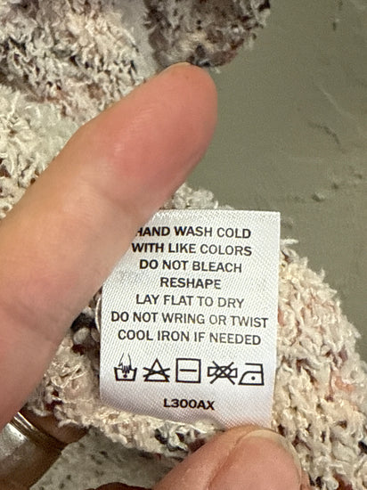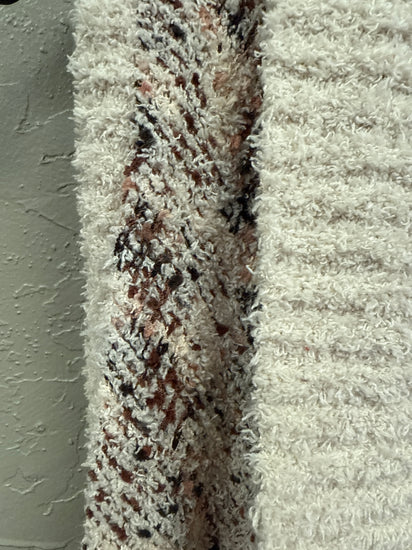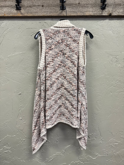 Description : New with tags open-front long sleeveless vest in a soft, textured knit with a wide ribbed shawl collar; overall heathered beige and taupe tones with subtle darker flecks and a drapey, cozy silhouette