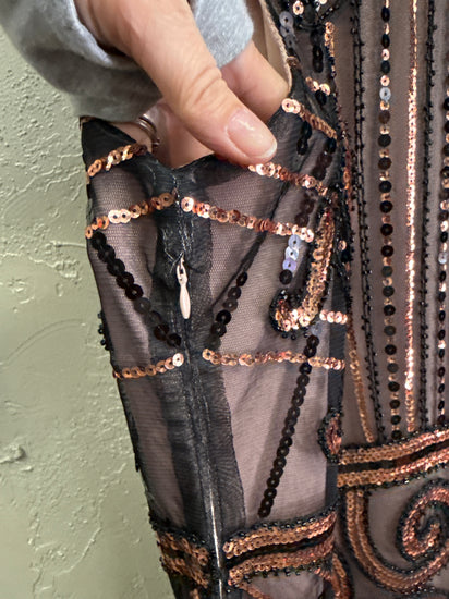 Description : A vintage-style sleeveless midi dress in sheer black mesh with nude lining, embellished with intricate bronze and black sequined scrollwork, vertical bead stripes, and a fringed hem. The front shows a rounded neckline, cap sleeves, a defined waist band, and ornate Art Deco-inspired beading throughout.